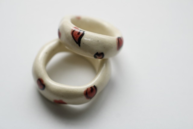 陶器のみでできた陶器リングです。 白地のマットな質感をベースに、赤いドットが刻まれたちょっと貴族感のあるリング。 暗めな色味になりがちな冬のコーディネートにおすすめです。 重いイメージのある陶器ですが、本体1〜2gとかなり軽いので一日中ストレス無くつけていられます。 ※陶器リング作品の内側には制作上必ず釉薬のついていない素地の部分ができますが、不良ではございません。 ◼︎素材 陶器 ◼︎サイズ オプション選択にある号数でのご用意となります。 ※全てのリングサイズに、.5も含めます。 例:12号=12〜12.5号 ひとつひとつ歪みがあるため、号数はあくまで目安としてお考えください。 太さのあるデザインなものは、◯号-◯号いった表記をしております。記載の号数の範囲でお考え下さい。 ※陶器製リングはよくある金属製のリングなどと同じサイズ仕様です。お手持ちのリングのサイズと比較してご検討下さい。 ▲ご使用にあたってのご注意▲ ※粘土の状態から成形し焼成、梱包、発送するまで全て一つ一つ手作業で行っております。ハンドメイド品である事ご理解いただけるようお願いいたします。 ※作品はデリケートですので取り扱いには充分お気をつけ下さい。 特に水濡れによりリングが抜けやすくなるので、水仕事や入浴時は外してご使用ください。