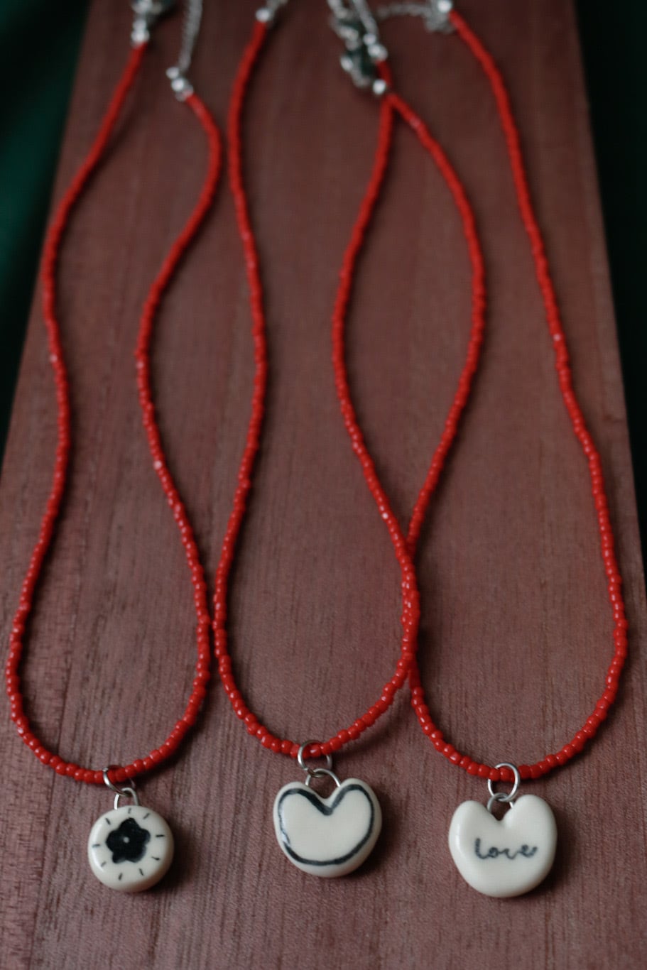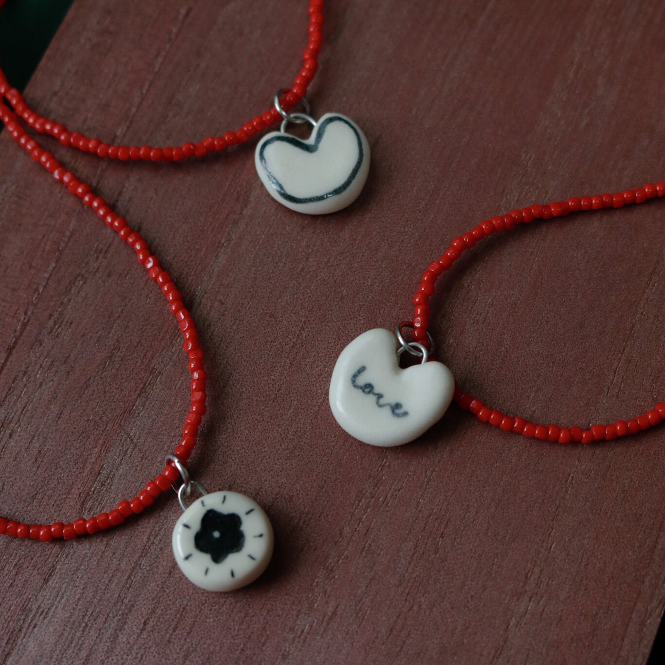 真っ赤なビーズネックレスに小さなモノクロモチーフ。