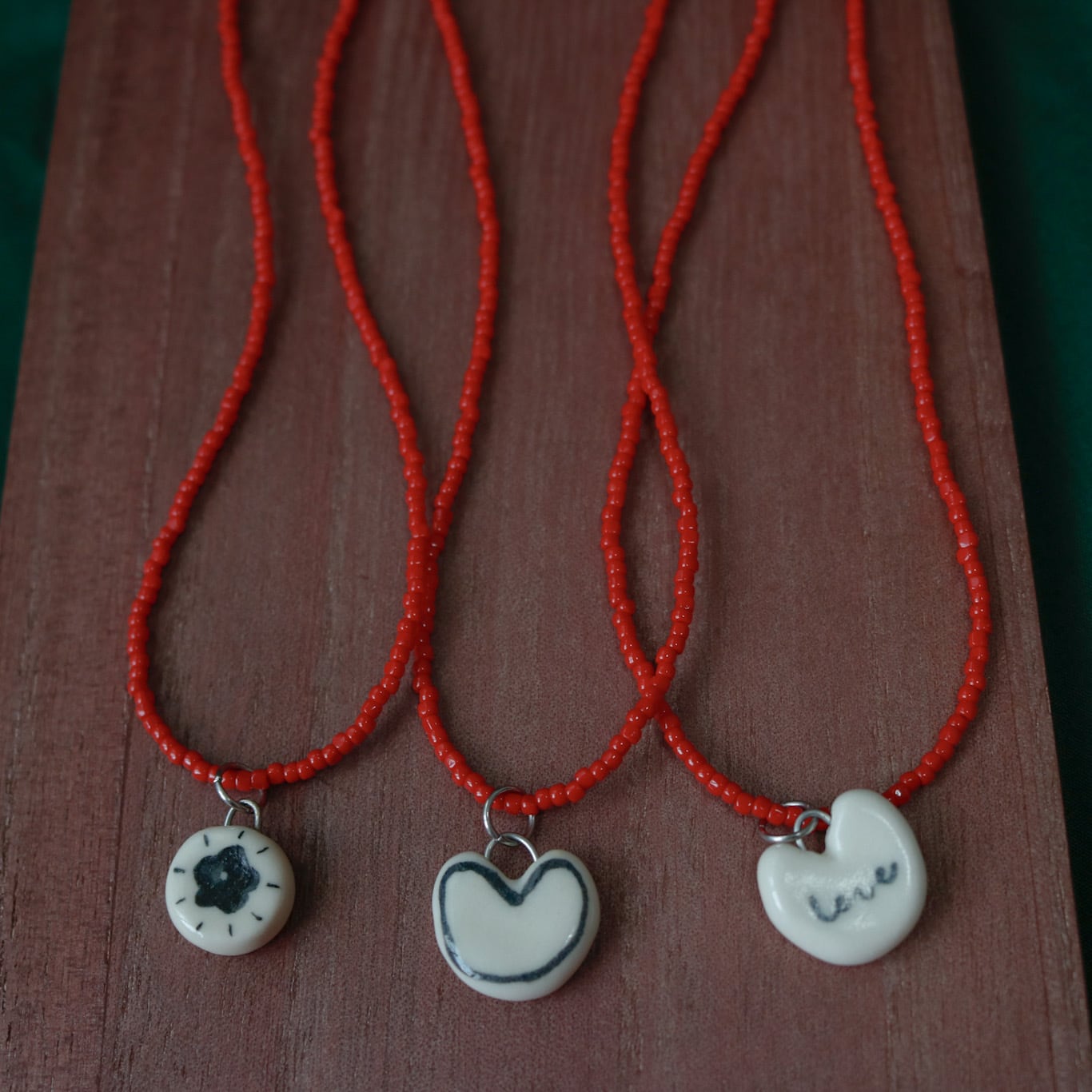 手書きの陶器ペンダントトップがついたビーズネックレスです。
