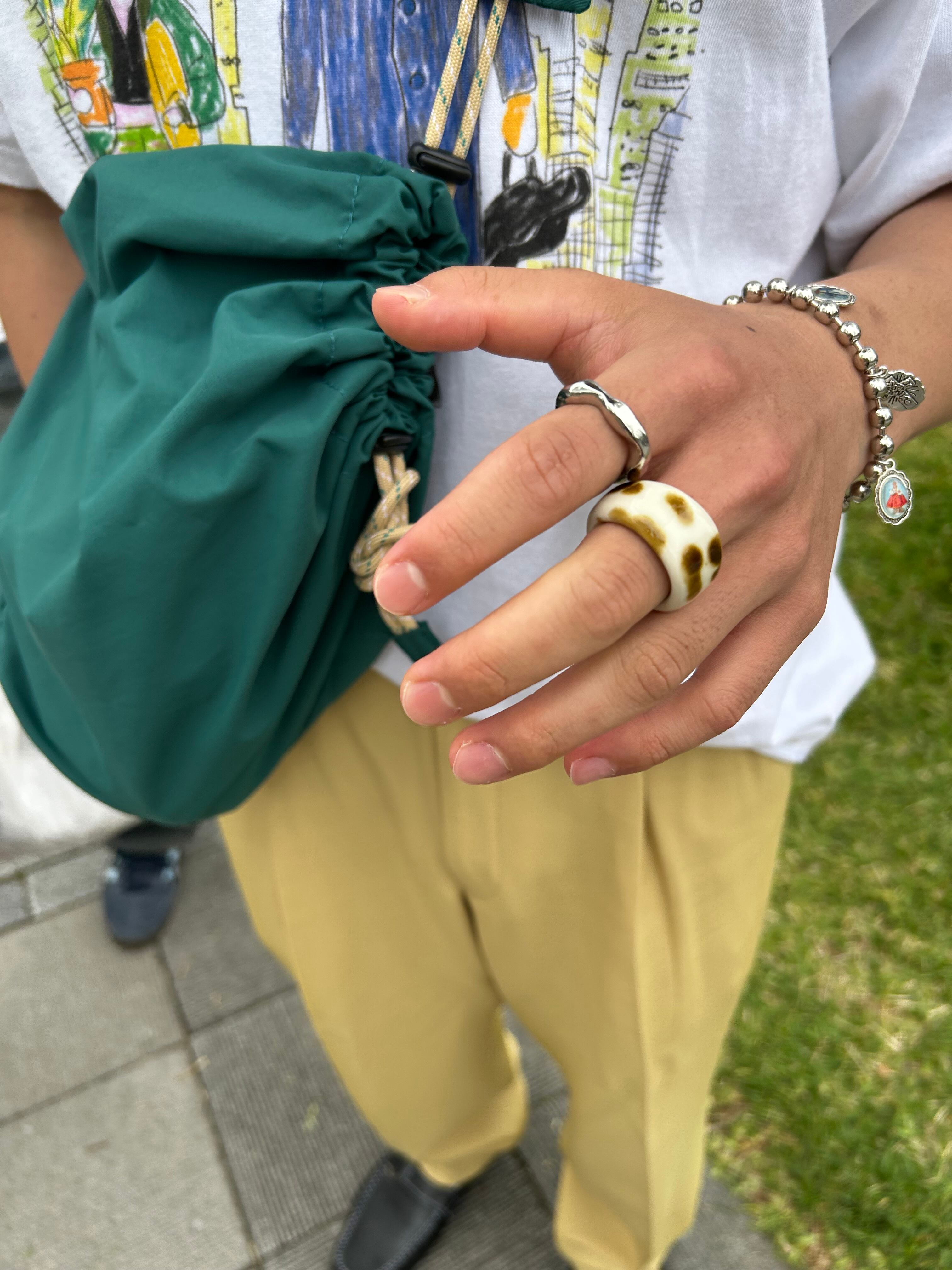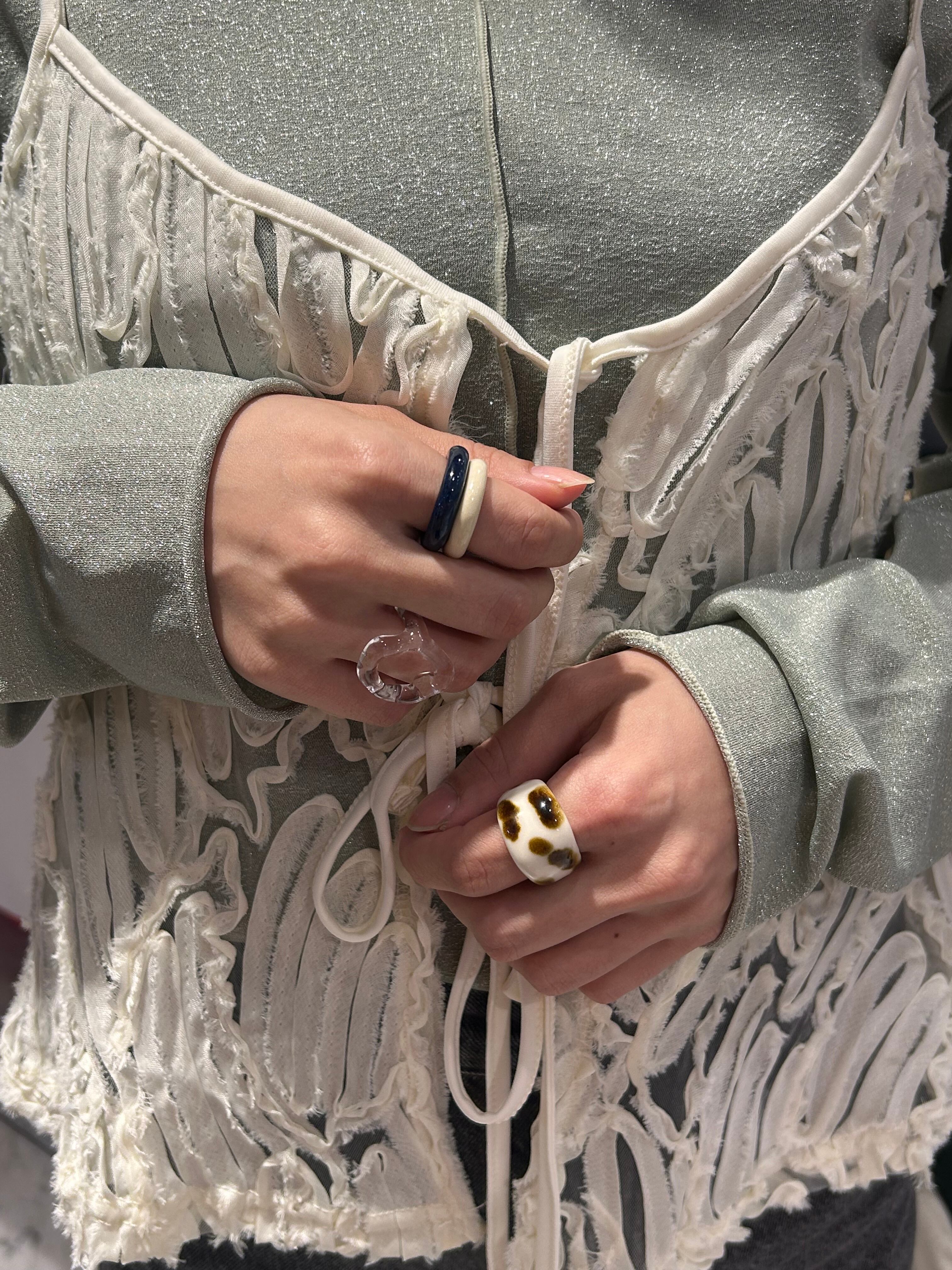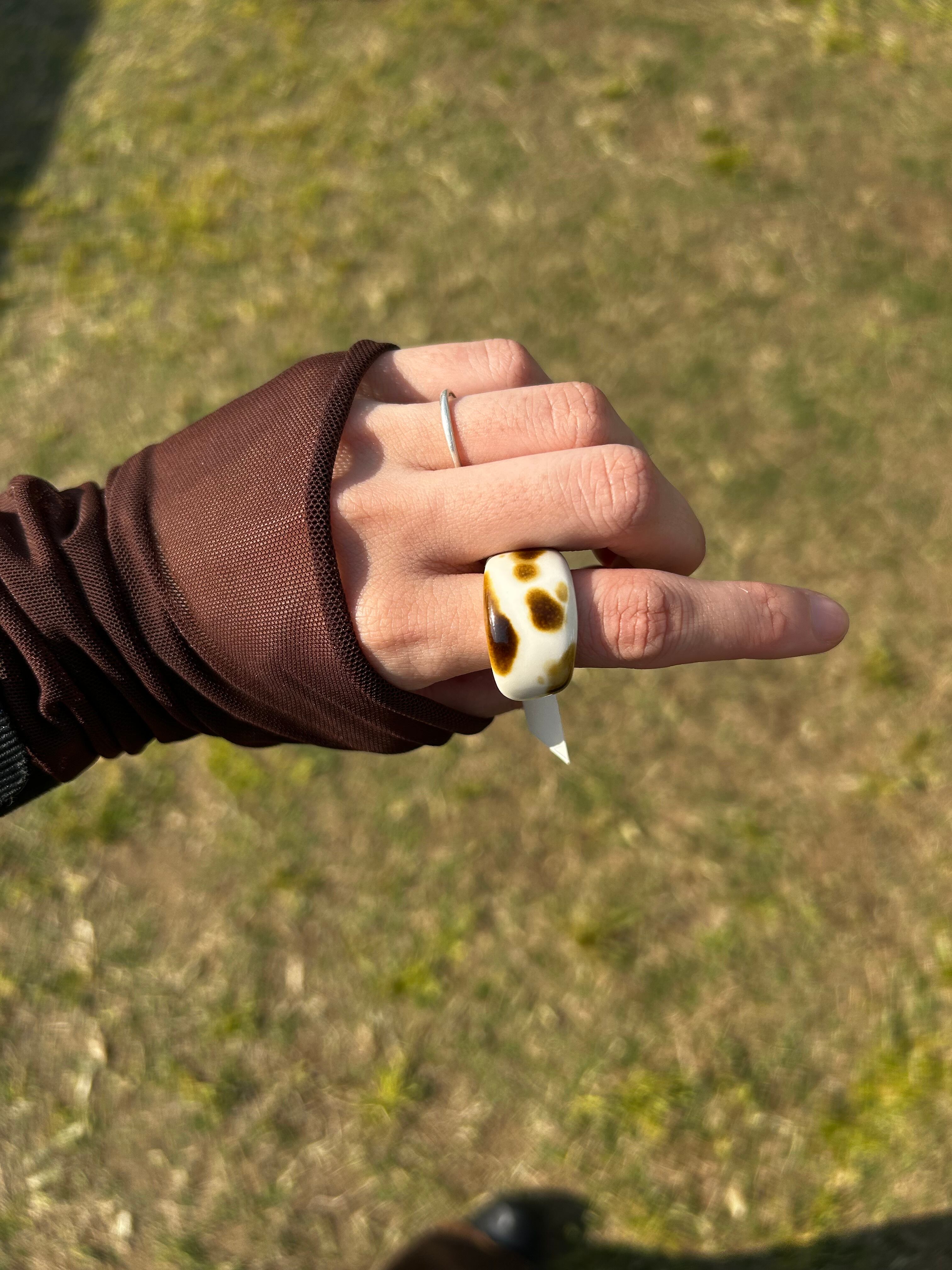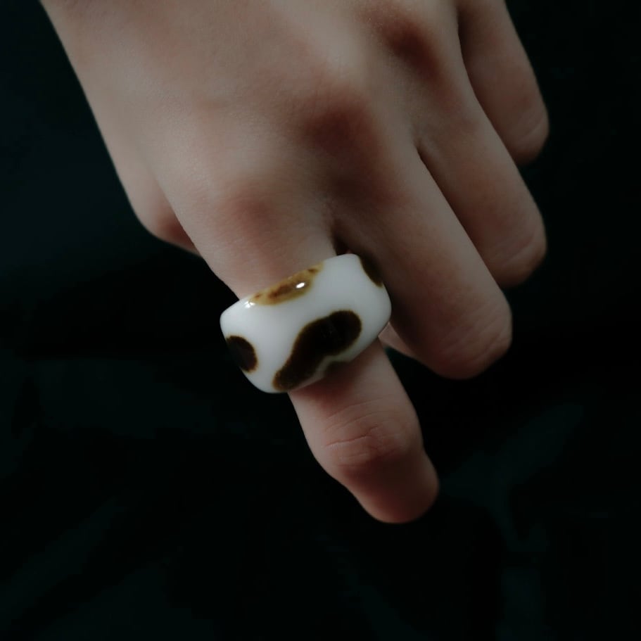 ぽってりとしたフォルムに、牛柄のような模様をまとった陶器リング。