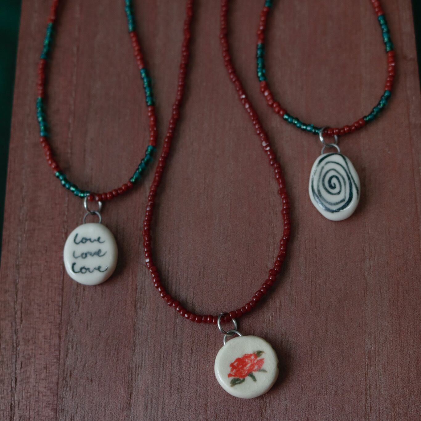 陶器のトップに、エンジ色ビーズをベースに組み合わせたネックレス。