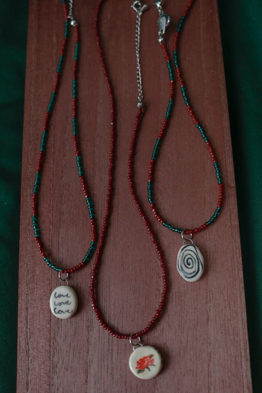 roseは単色で、love,uzuはグリーンのビーズを組み合わせています。