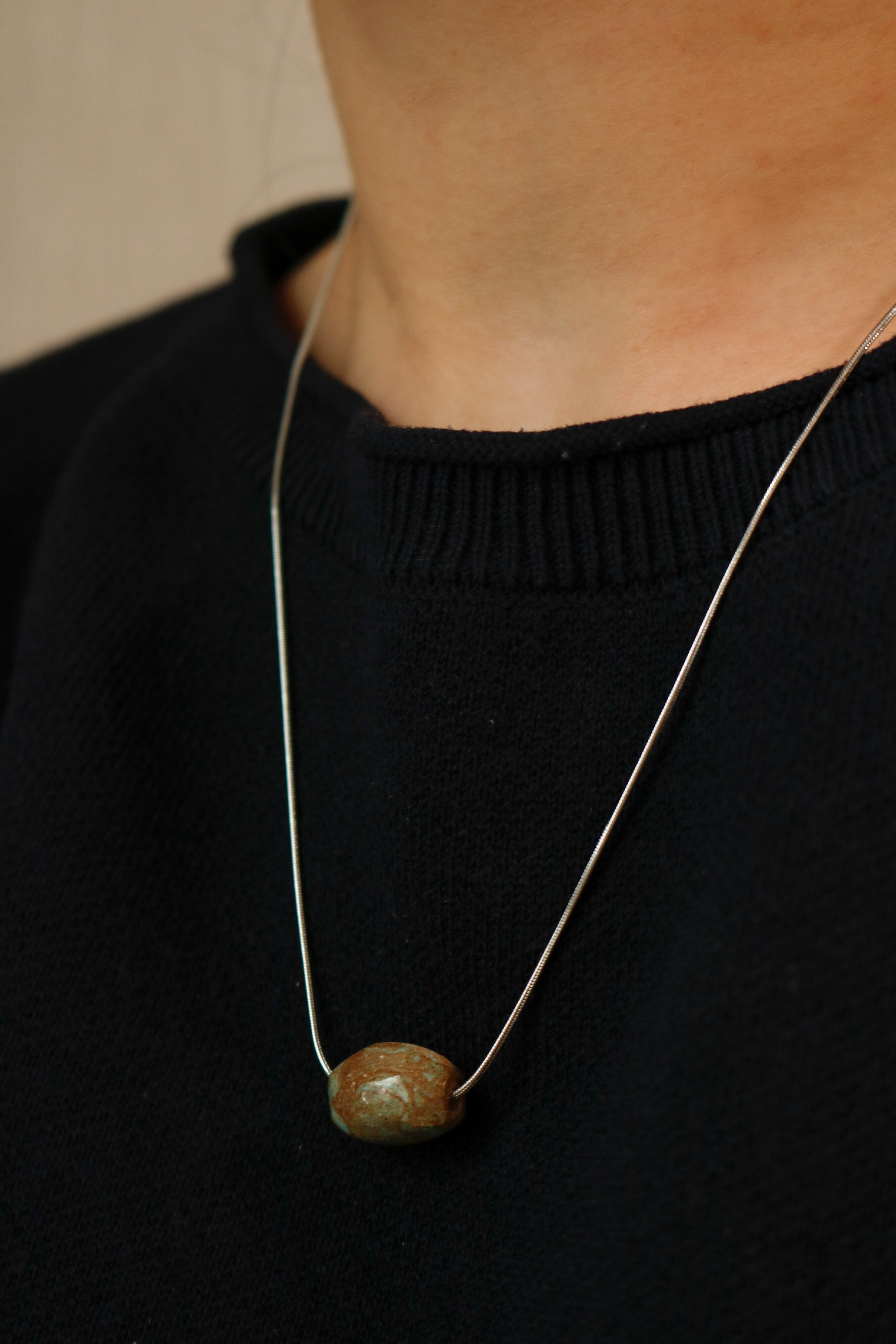 ショートタイプよりも約10cm長く、ゆとりのあるネックレス。練り込みのストーンはどれも一点ものです。